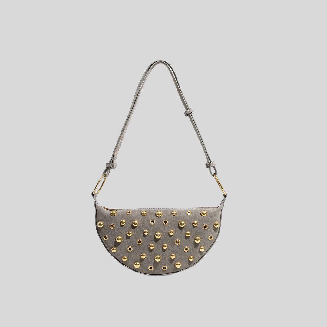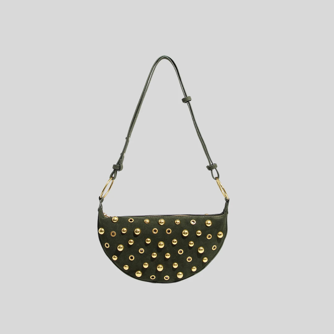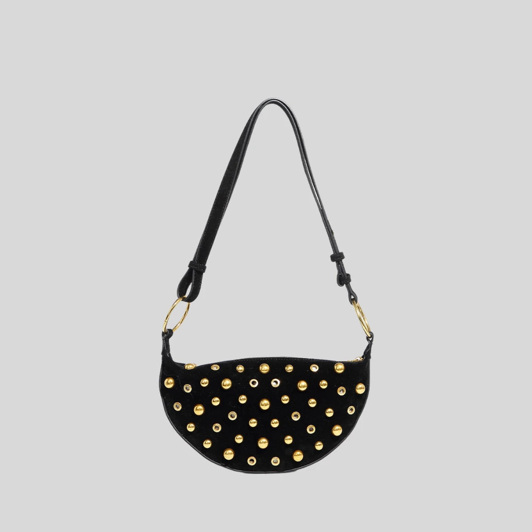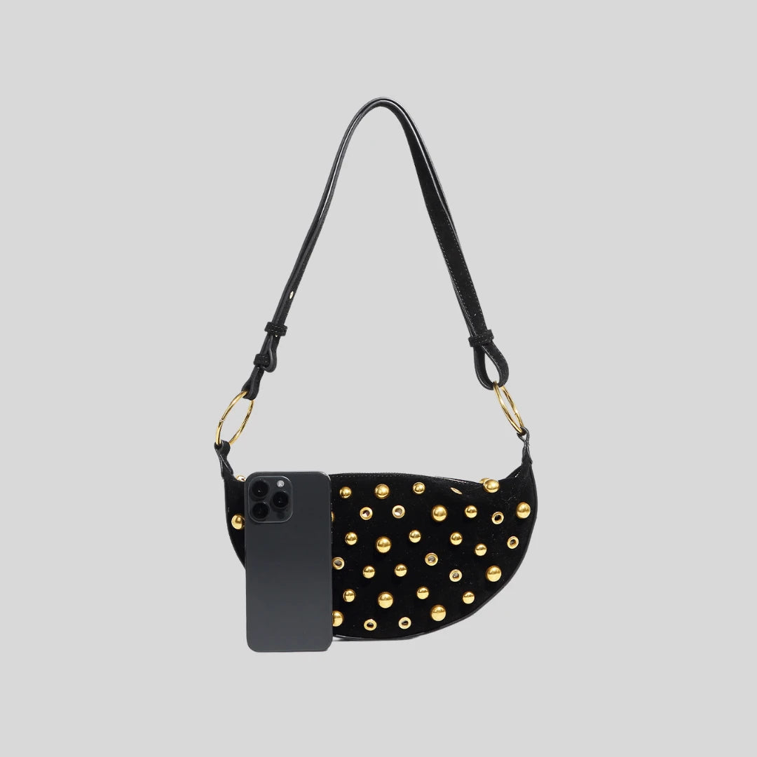 Written in the stars. The Constellation features a sleek crescent silhouette adorned with scattered gold studs like stars in the night sky. Crafted in premium vegan leather for celestial style, guilt-free.