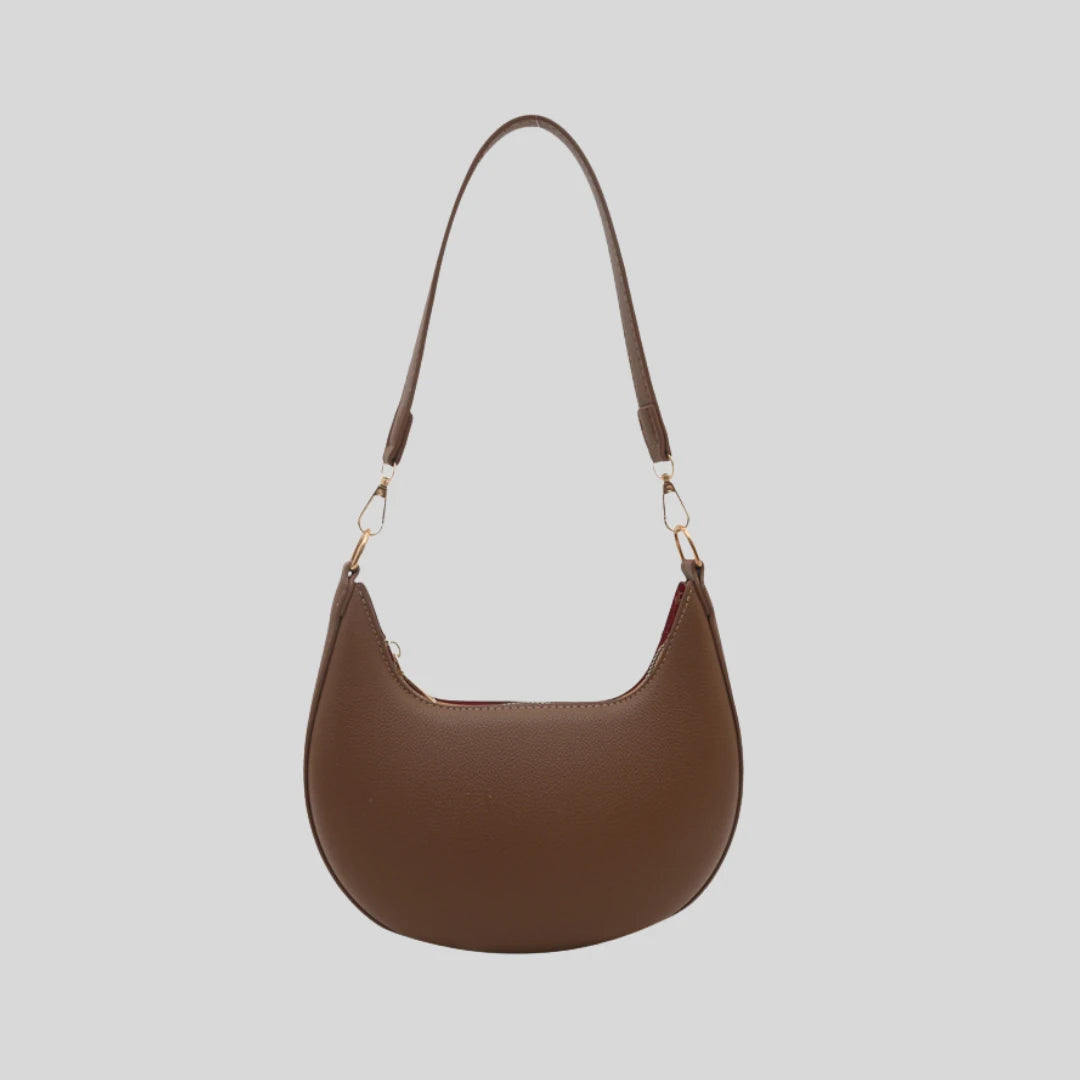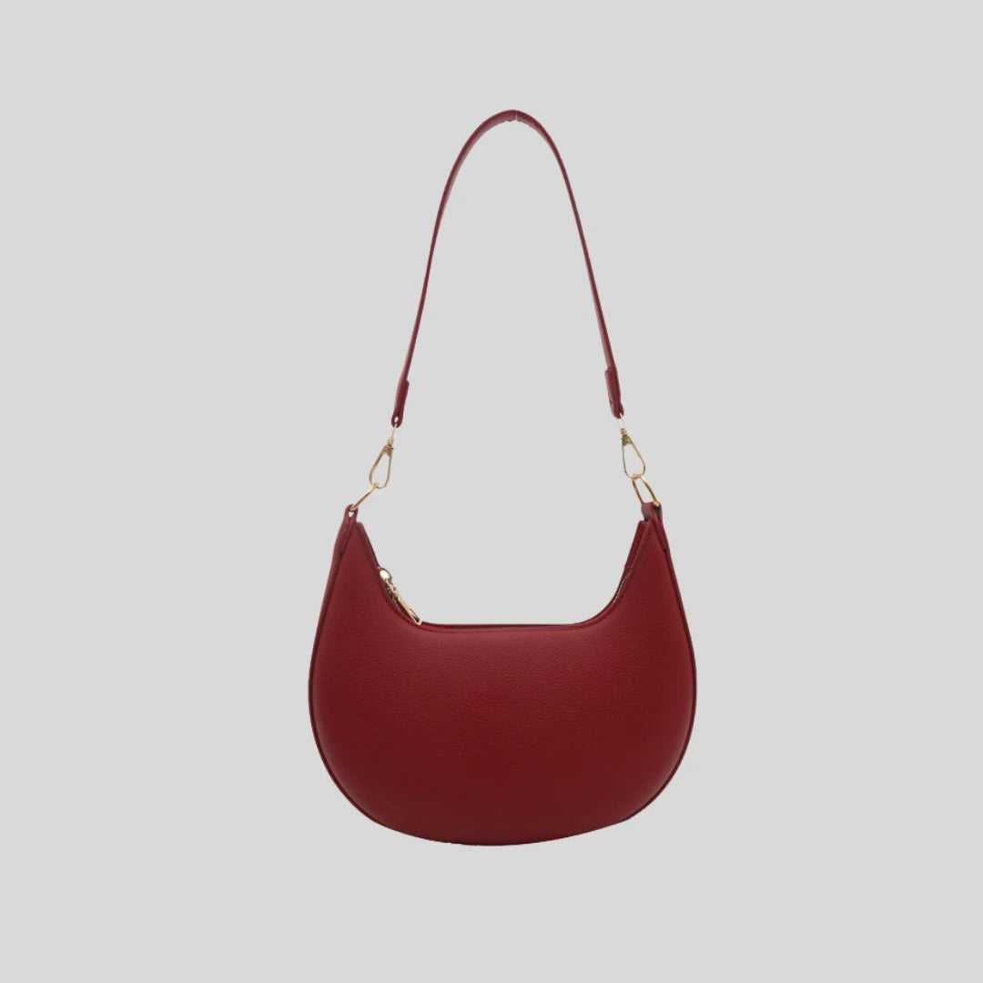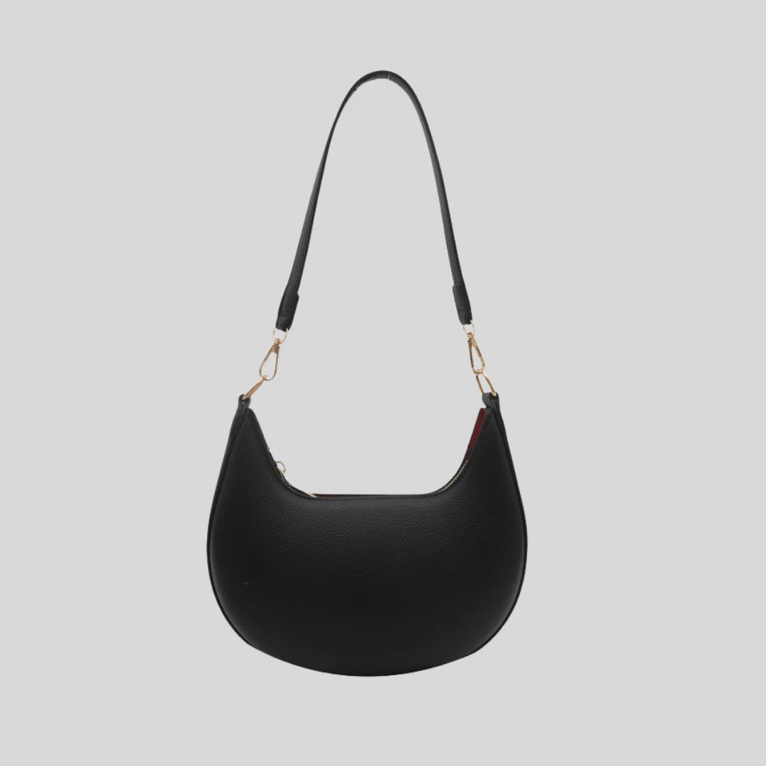 Compact elegance, perfected. The Demi features that coveted half-moon silhouette with gold clasp details and a pop of color inside. Crafted in premium vegan leather for guilt-free chic.