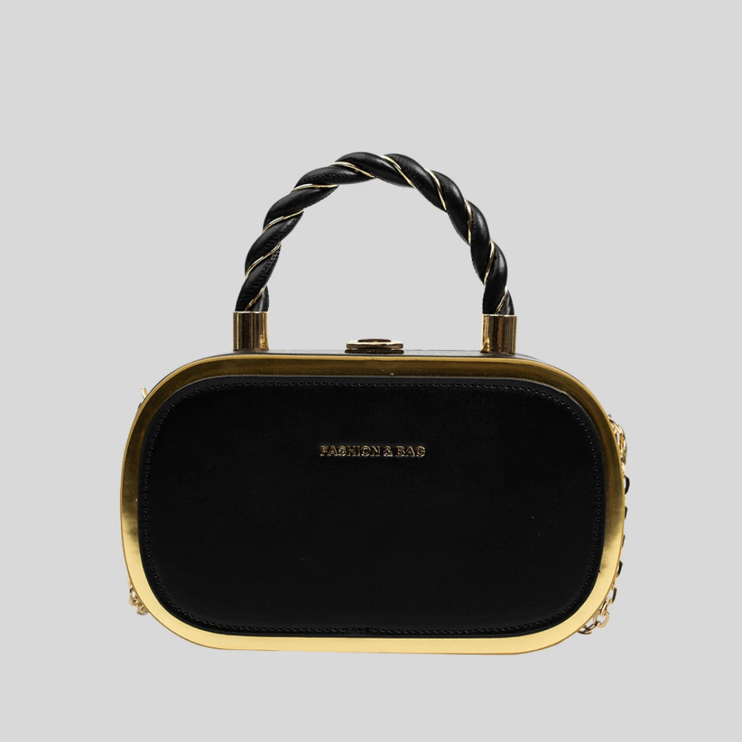 Red carpet ready. The Gala features a structured box silhouette with luxe gold frame and signature twisted rope handle. Crafted in premium vegan leather for guilt-free glamour.