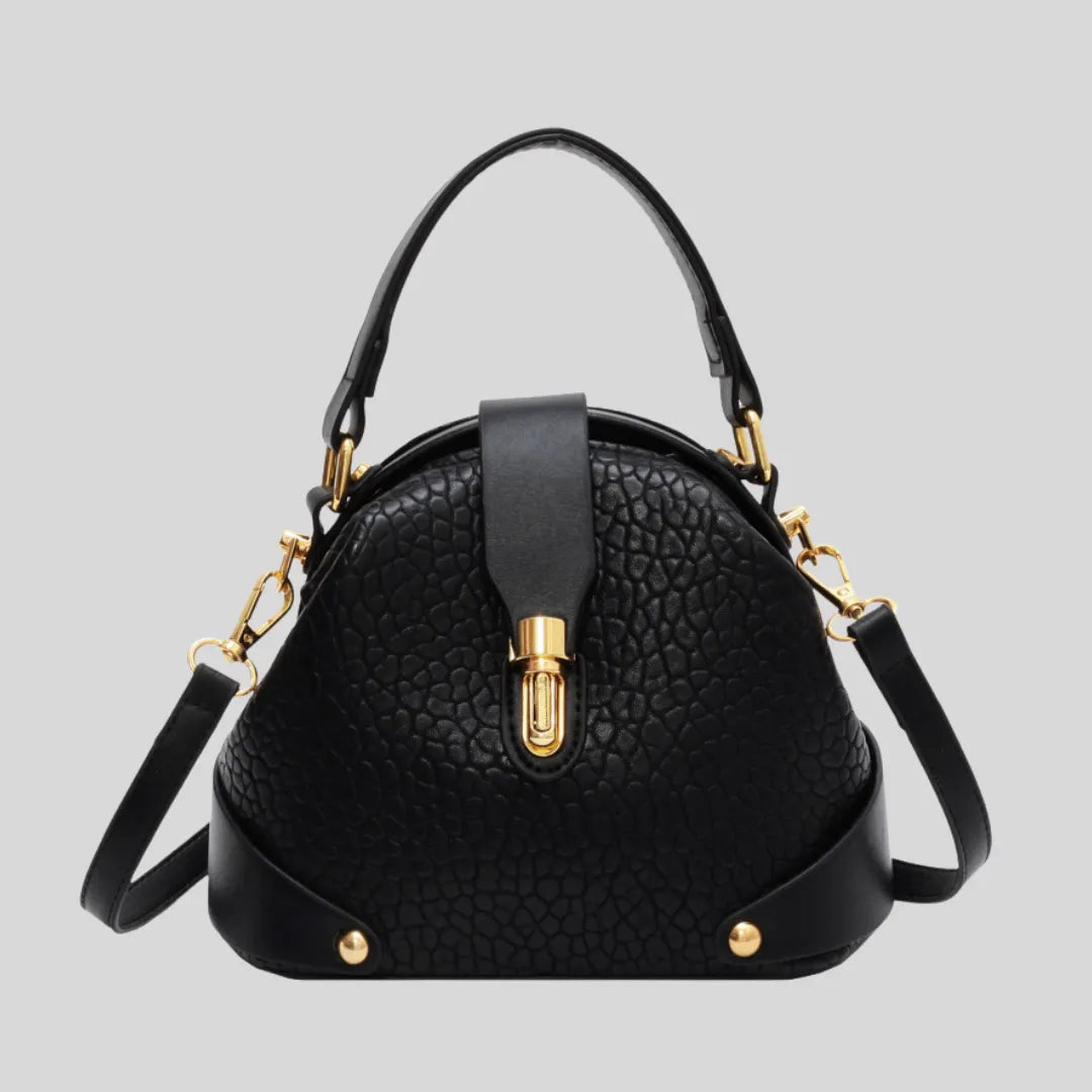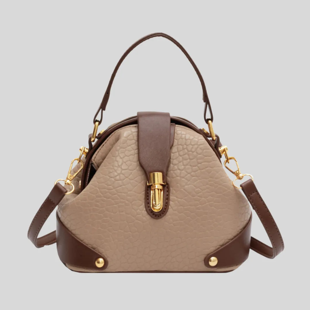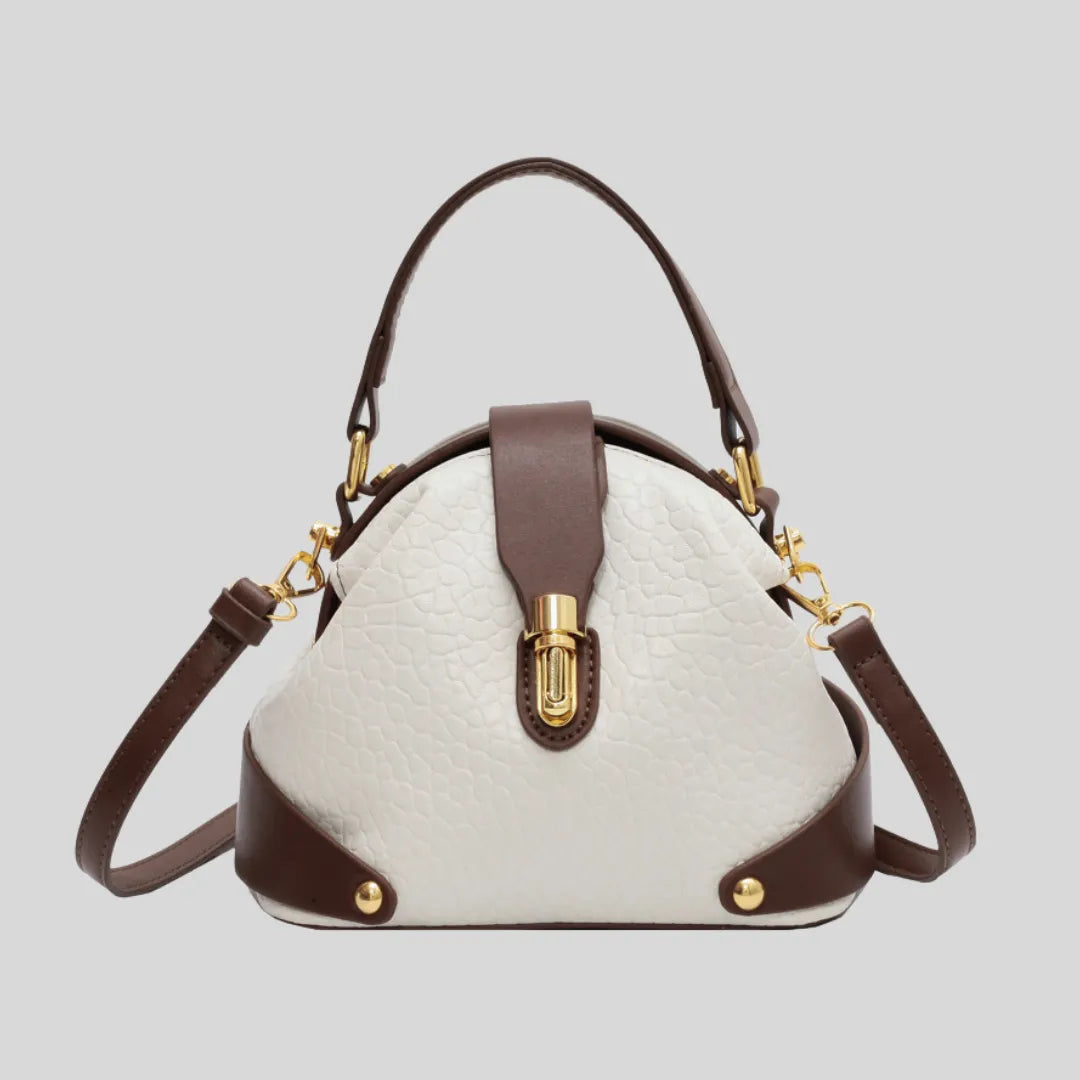 Precious by design. The Pearl features a unique rounded shell silhouette with croc-embossed cream leather and chocolate brown trim. Gold hardware and decorative studs complete this vintage-inspired treasure. Crafted in premium vegan leather.