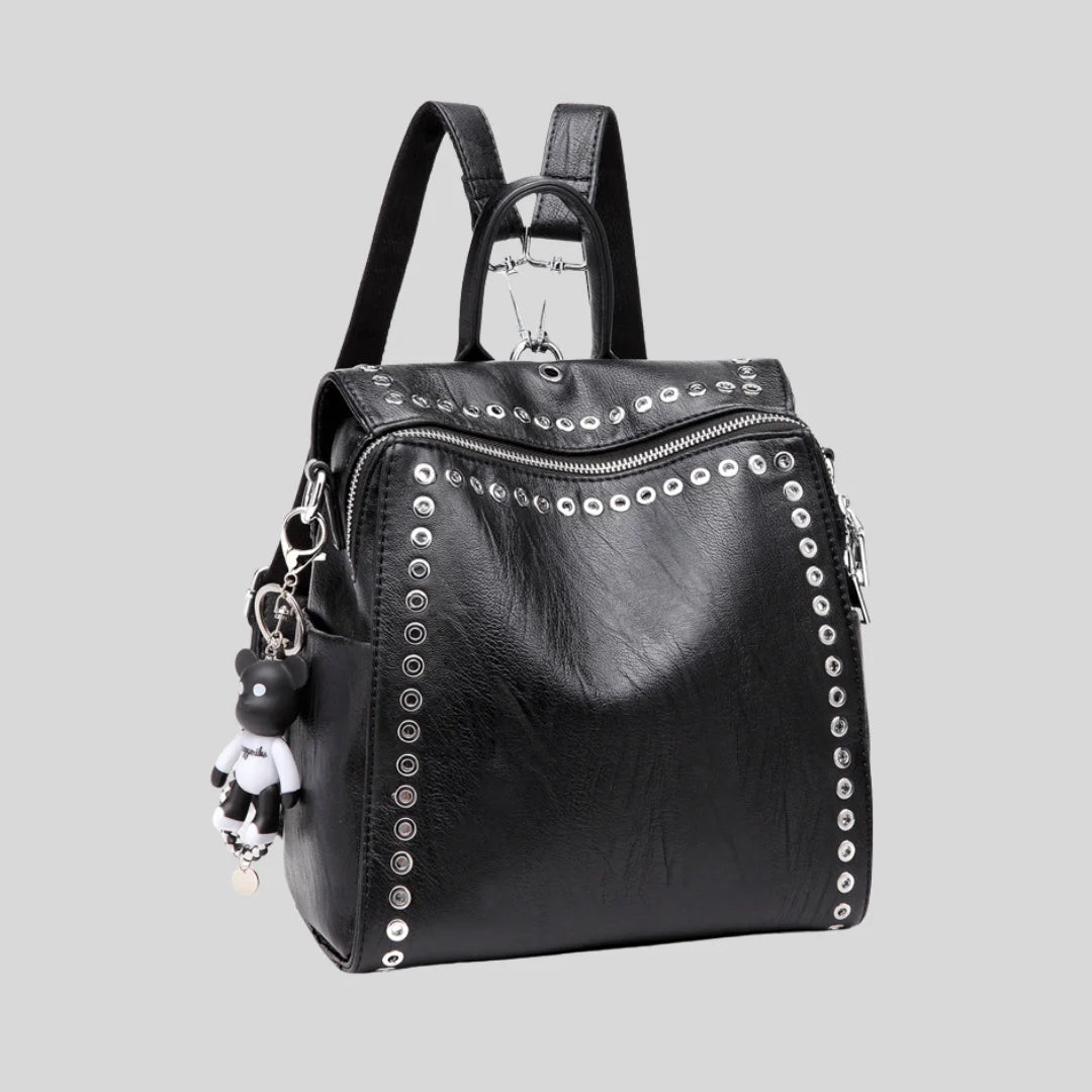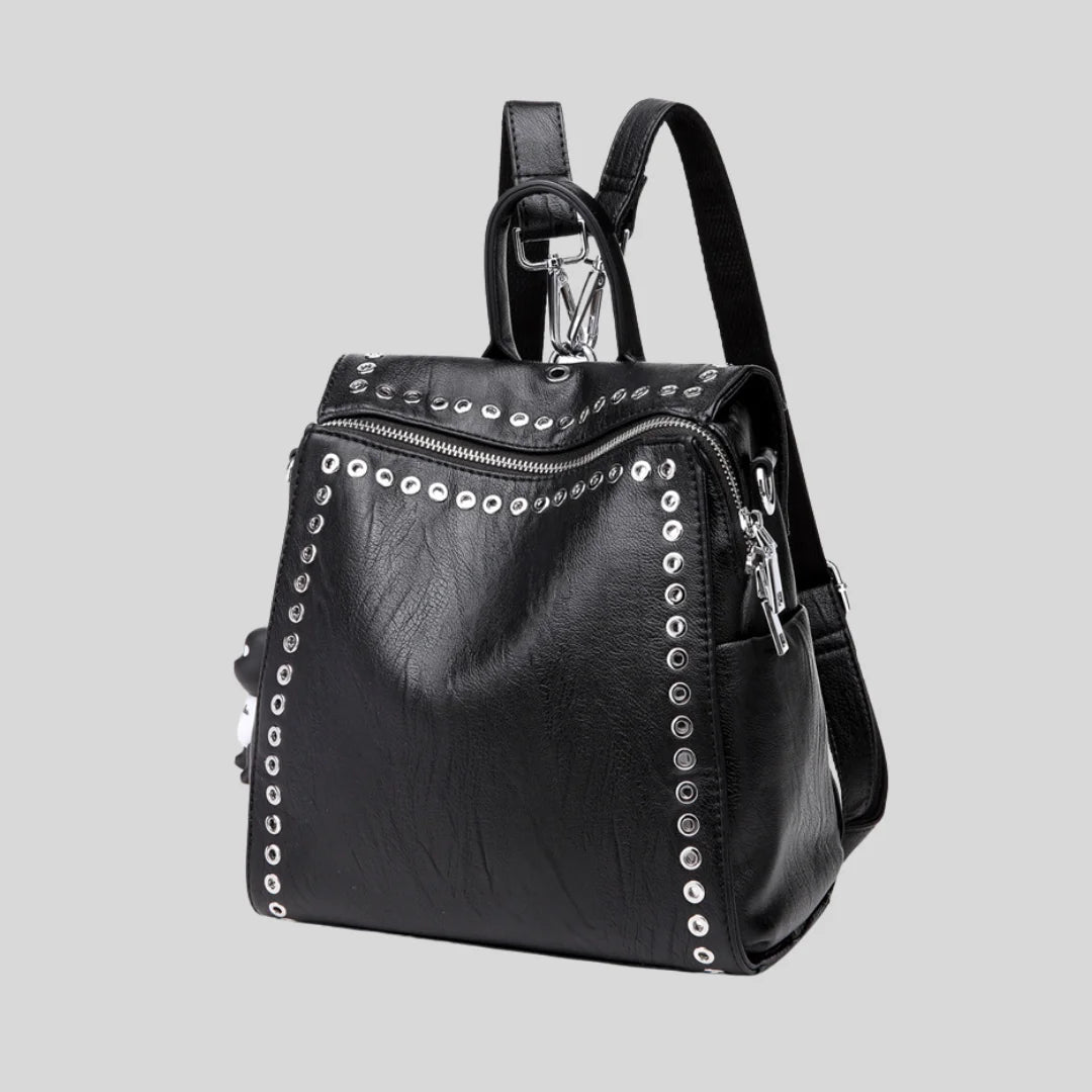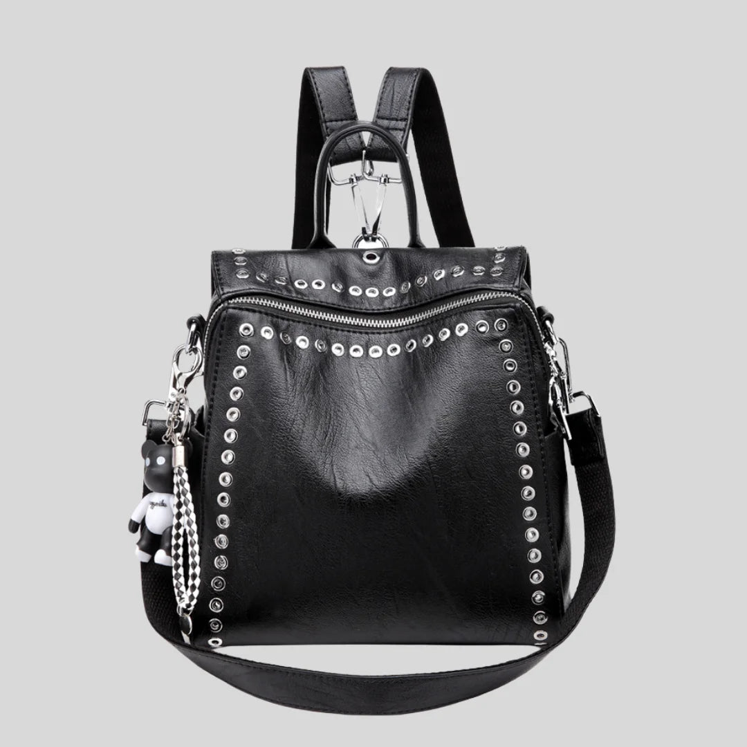 Convertible backpack with silver grommet details. Wear it as backpack, crossbody, or shoulder bag.