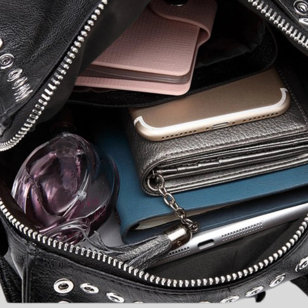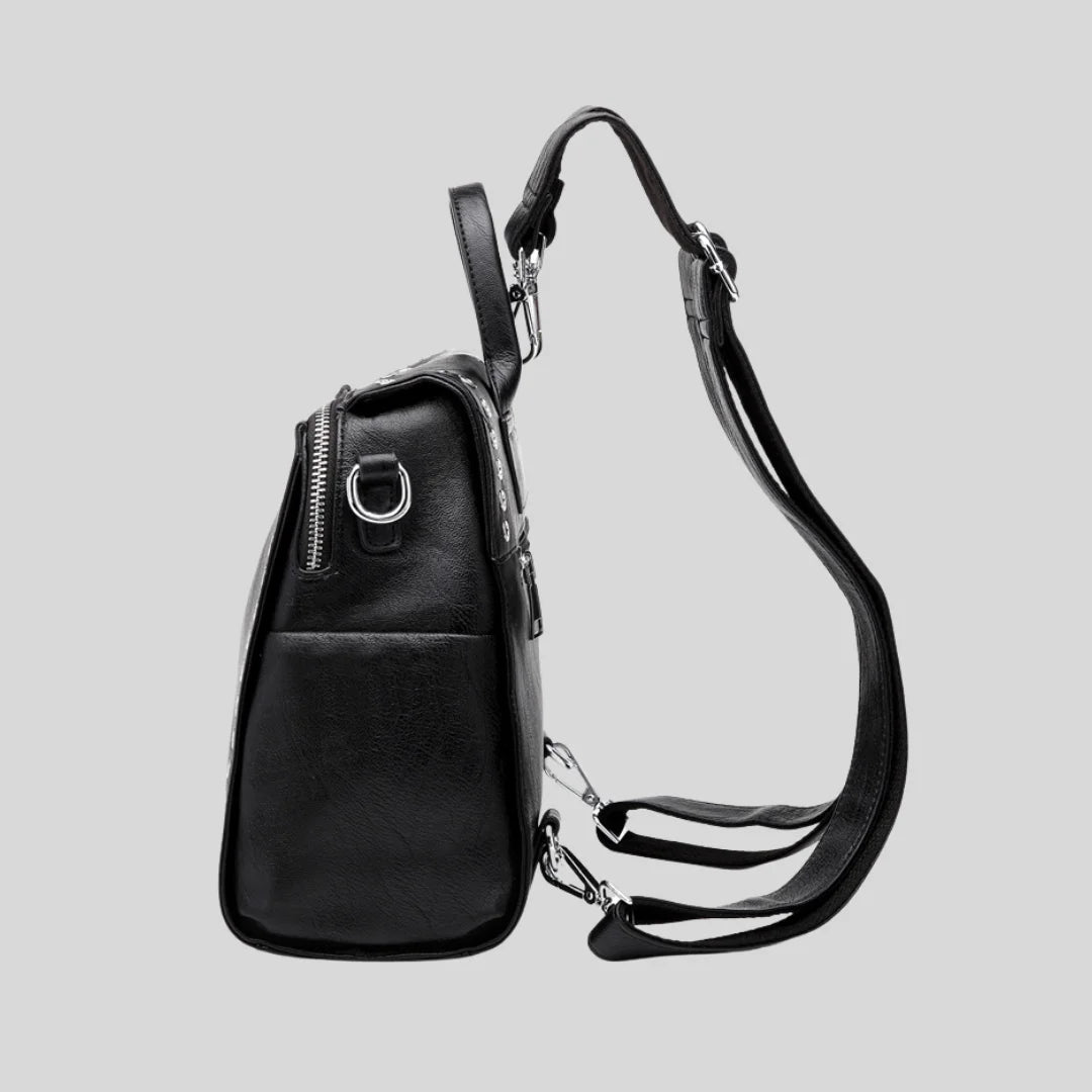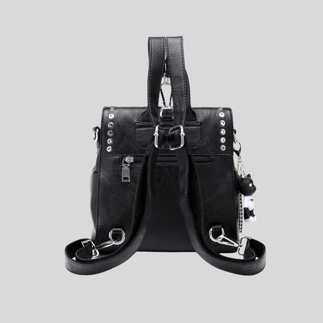 Convertible backpack with silver grommet details. Wear it as backpack, crossbody, or shoulder bag.